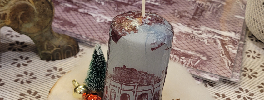 Une bougie décorée d'un paysage urbain est posée sur un socle en bois, entourée de neige artificielle, de petites pommes de pin et d'ornements festifs - un présentoir de Noël enchanteur d'un atelier créatif, le tout disposé sur un tissu à motifs. - Musée de la Toile de Jouy