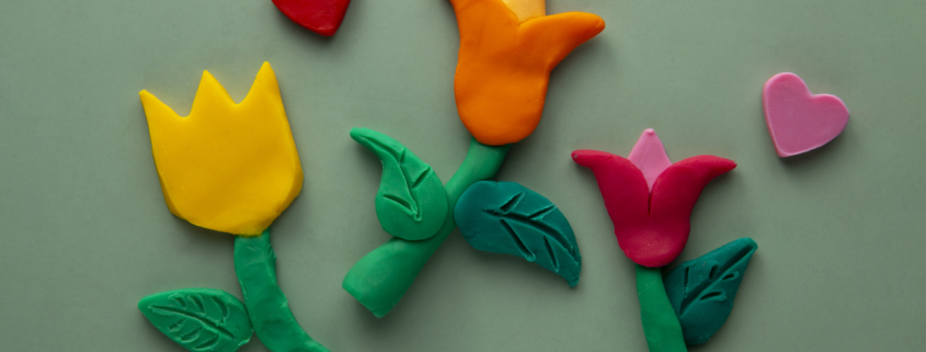 Des fleurs colorées en pâte à modeler avec des tiges et des feuilles vertes sont disposées sur une surface verte, entourées de cœurs rouges et roses, parfaits pour un atelier créatif de modelage de fleurs à l'argile. - Musée de la Toile de Jouy