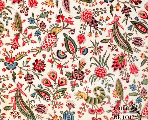 Un motif floral coloré et complexe inspiré par le Musée de la Toile de Jouy, avec des oiseaux, des feuilles et des fleurs en rouge, bleu, vert et jaune sur un fond crème pour un design botanique vibrant. - Musée de la Toile de Jouy