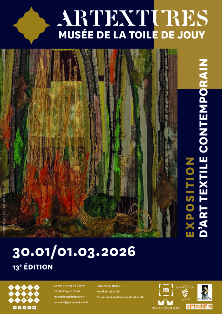 Du 30 janvier au 1er mars 2026, le Musée de la Toile de Jouy présente « Artextures », une exposition d’art textile contemporain portée par l’association France Patchwork. Pour cette 13e édition, ce concours international révèle une sélection d’œuvres singulières où chaque plasticien sublime la matière par des jeux de mouvement et de textures. Une exploration surprenante de l’art textile d’aujourd’hui au cœur d’un lieu chargé d’histoire.