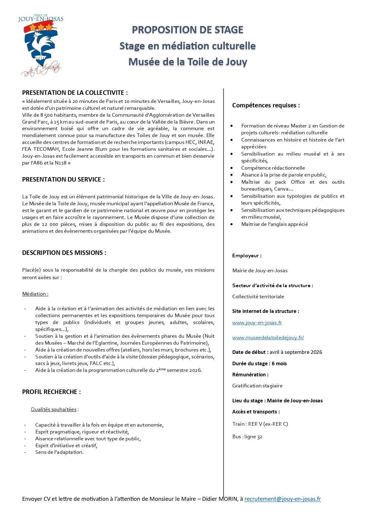 Un dépliant avec texte annonçant la communication offres de stage au Musée de la Toile de Jouy, comprenant des sections sur l'organisation, les missions de stage, les compétences requises, les détails du stage, et les instructions de candidature. - Musée de la Toile de Jouy