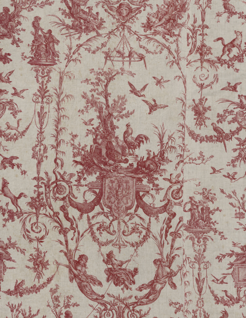 Motif de toile rouge et blanche représentant des scènes pastorales, des oiseaux, des arbres et des motifs tourbillonnants ornés, avec des chérubins et des médaillons. Les détails complexes évoquent un style vintage et classique inspiré par le Musée de la Toile de Jouy. - Musée de la Toile de Jouy