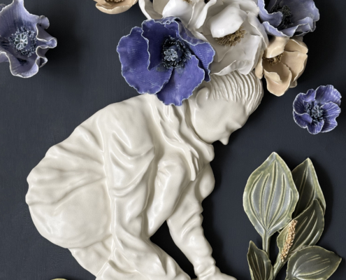 Œuvre d'art en céramique représentant un enfant agenouillé avec des fleurs s'épanouissant sur sa tête, entouré de feuilles vertes et de fleurs bleues, blanches et beiges sur un fond sombre. - Musée de la Toile de Jouy